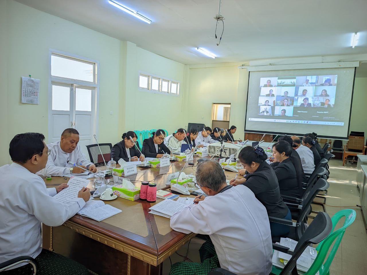 ပင်စင်ဦးစီးဌာန၊ တိုင်းဒေသကြီး/ပြည်နယ်ဦးစီးမှူးများမှ Video Conferencing စနစ်ဖြင့် တက်ရောက်စဉ်