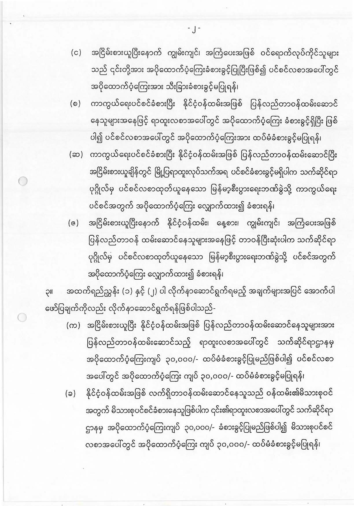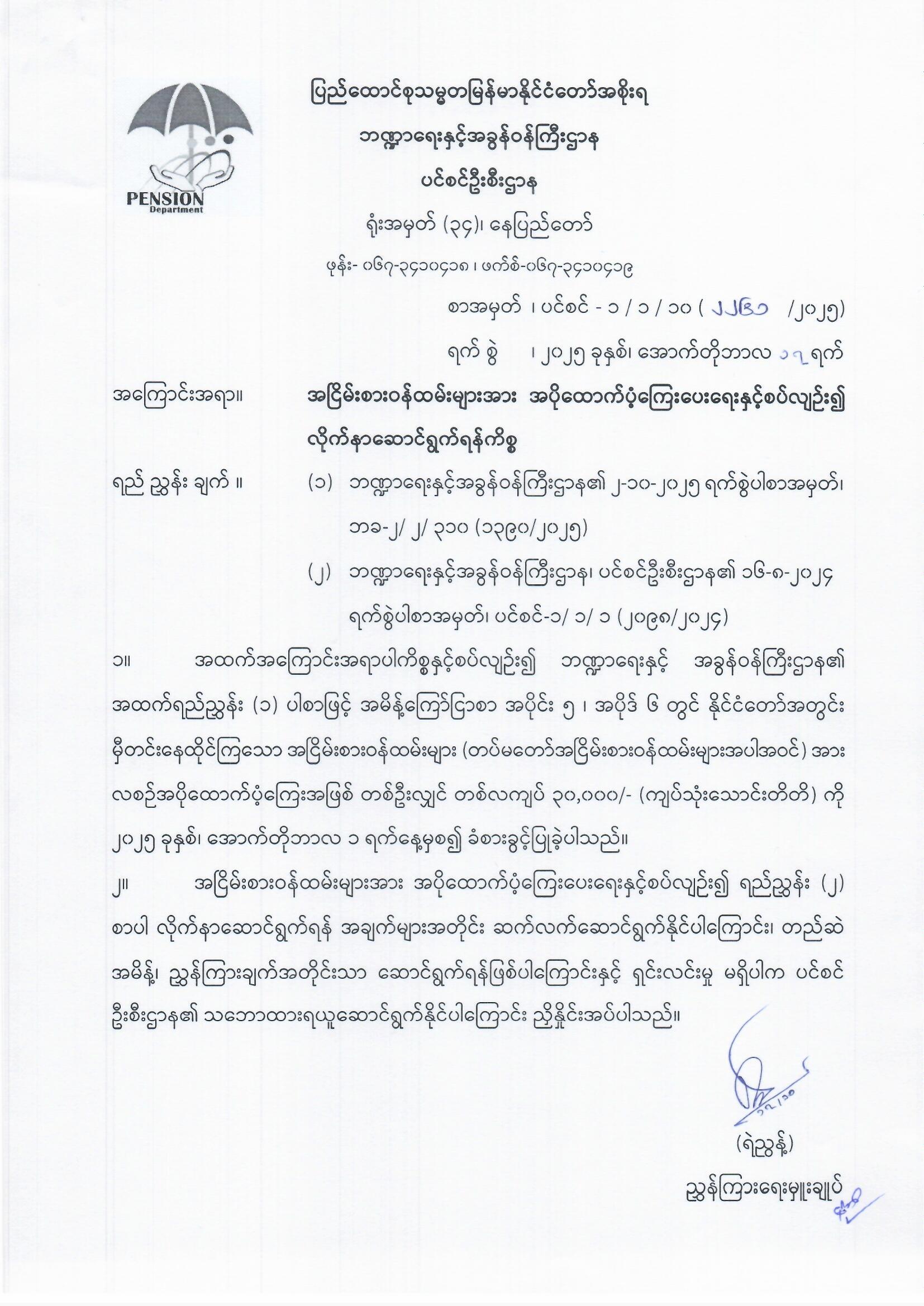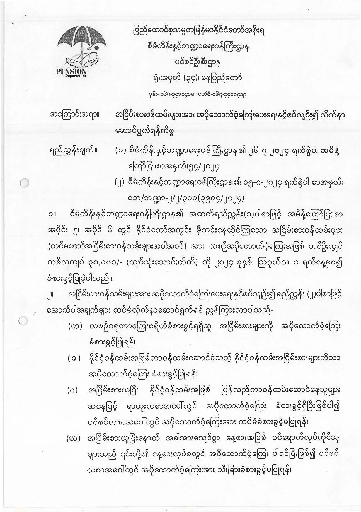 နိုင်ငံတော်တာဝန်များကို ကျေပွန်စွာထမ်းဆောင်ခဲ့ကြသည့် အငြိမ်းစားများကို နိုင်ငံတော်မှ ပြန်လည်ချီးမြှင့်သောအားဖြင့် ပင်စင်လစာအပြင် အပိုထောက်ပံ့ကြေးပေးခြင်းကို ၂၀၂၄ ခုနှစ် ဩဂုတ်လတွင် တစ်ကြိမ်၊ ၂၀၂၅ ခုနှစ် အောက်တိုဘာလတွင် တစ်ကြိမ်ဖြင့် စုစုပေါင်း နှစ်ကြိမ် (ကျပ် ခြောက်သောင်းတိတိ) ခံစားခွင့်ပြုခဲ့ပါသည်။