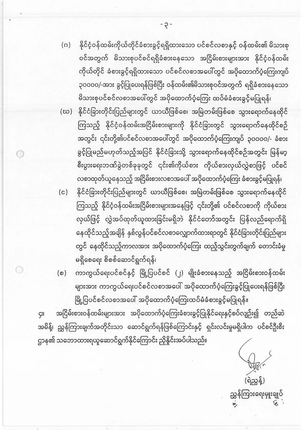 (၂) လက်ရှိတွင် နိုင်ငံ့ဝန်ထမ်း (နေ့စား၊ ကျွမ်းကျင်၊ အကြံပေး) အဖြစ် တာဝန်ထမ်းဆောင်နေပြီး ပင်စင်အမျိုးအစားတစ်ခုခု ခံစားနေပါက ဝန်ထမ်းလစာအပေါ်တွင်သာ အပိုထောက်ပံ့ကြေး ခံစားခွင့် ရရှိမည်ဖြစ်ပါသည်။